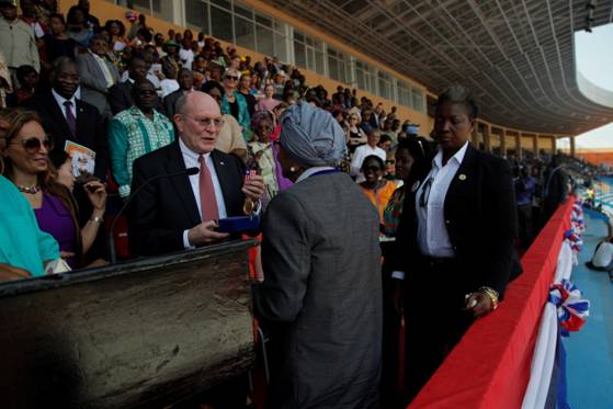 | Prof. Frank Stangenberg-Haverkamp receives the ‘Medal of Honour’ from H.E. Ellen Johnson Sirleaf, the President of Liberia |